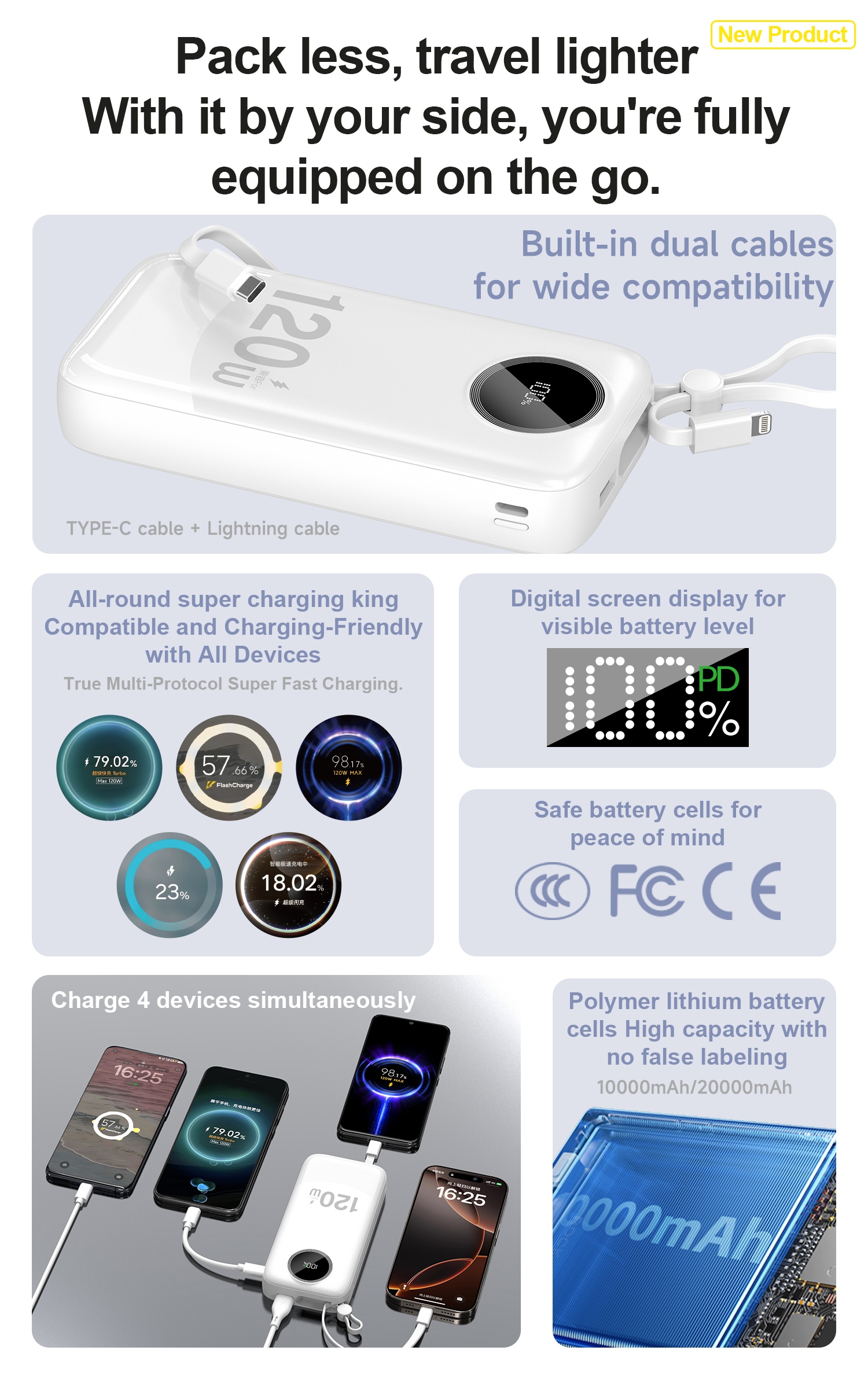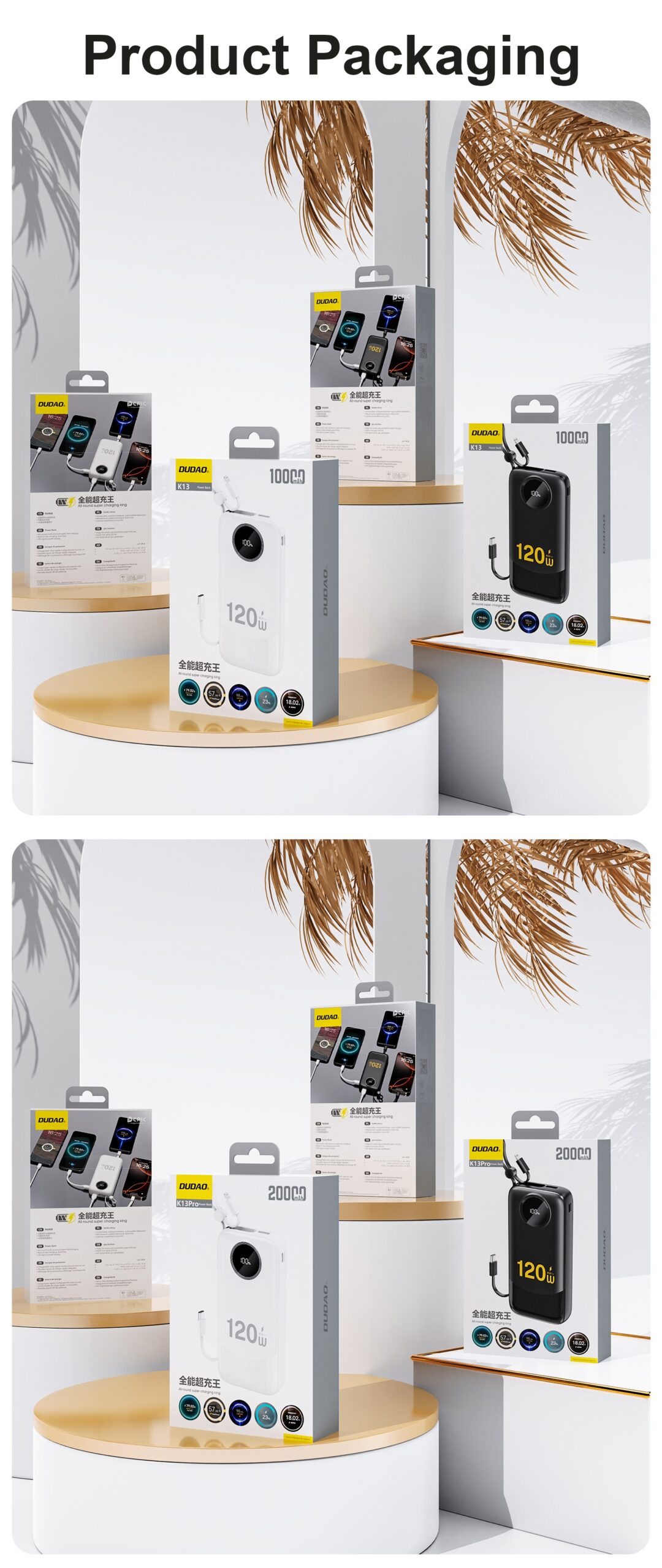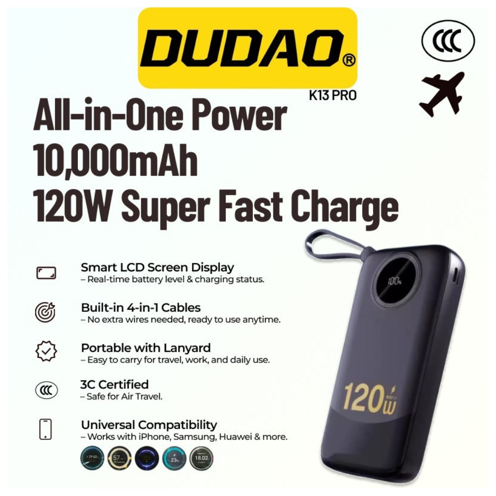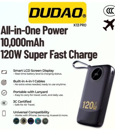 The Dudao K13Pro 10,000 mAh power bank is a compact power bank that offers fast and safe charging in all conditions. It supports multiple fast charging protocols, including QC2.0/QC3.0, FCP, AFC, SCP, PD2.0/PD3.0, and PPS, making it compatible with devices from brands like Xiaomi, Huawei, Oppo, Samsung , and Apple. Built-in USB-C and Lightning cables, additional USB-C and USB-A ports, and the ability to charge up to 4 devices simultaneously make it exceptionally practical. A digital LED display constantly displays the power level and charging power, while a safety system protects against short circuits and overheating. It’s a reliable power source for travel and everyday use.