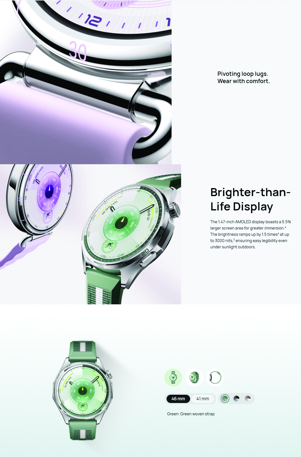 Display: 1.47″ AMOLED display (46mm) / 1.32″ AMOLED display (41mm)