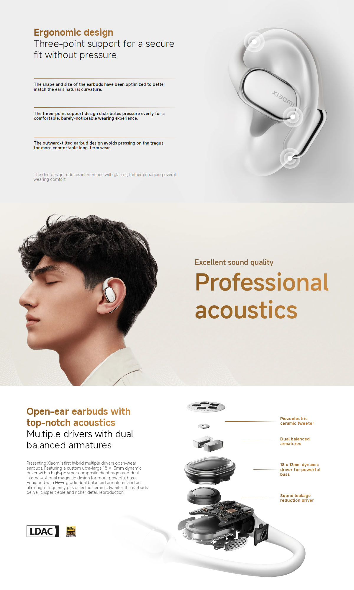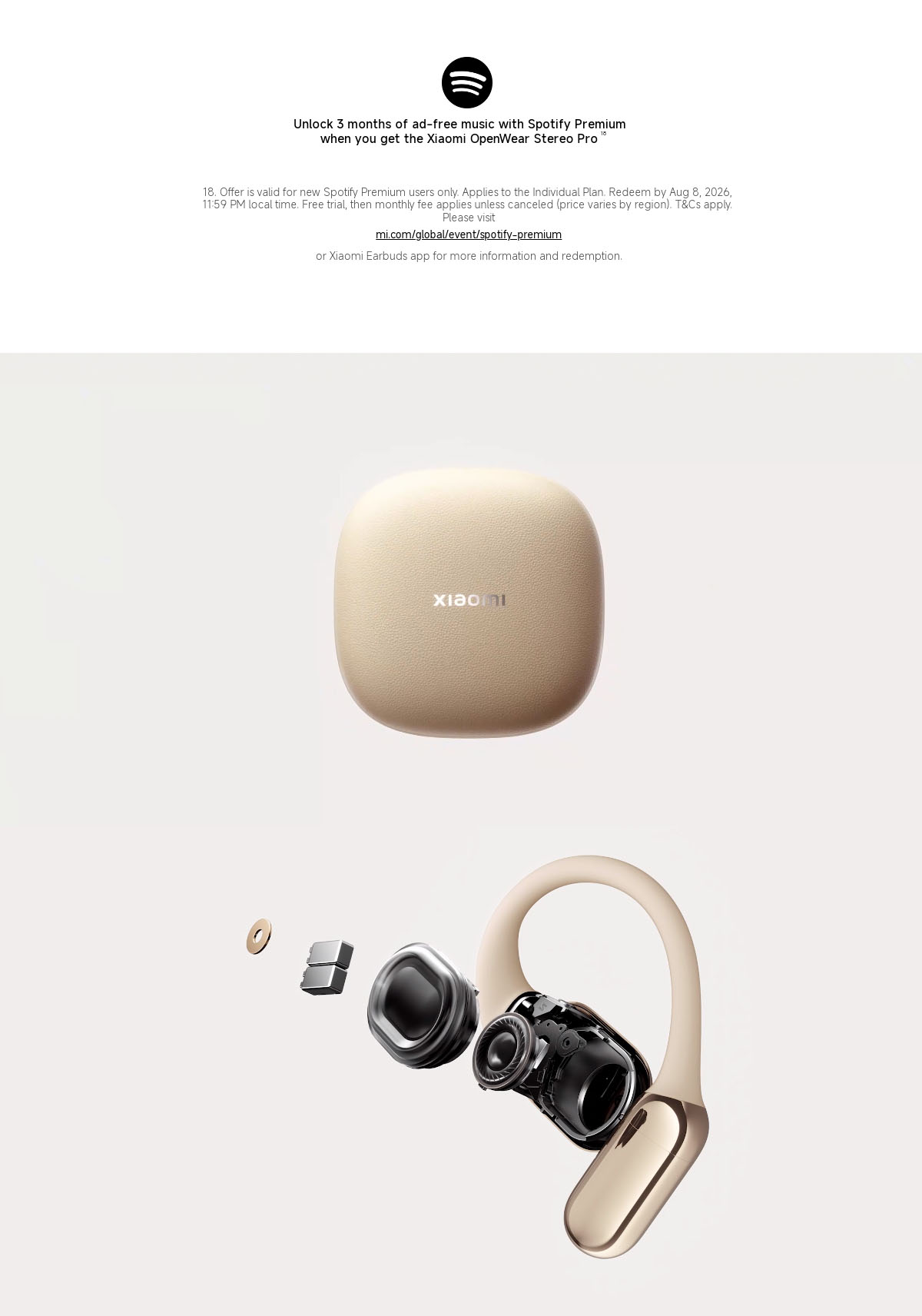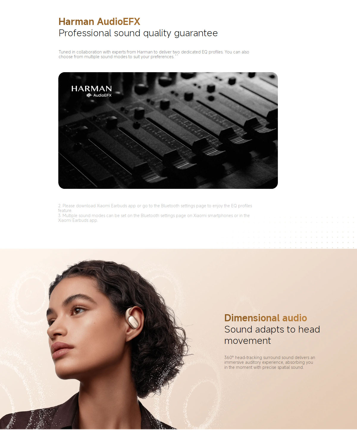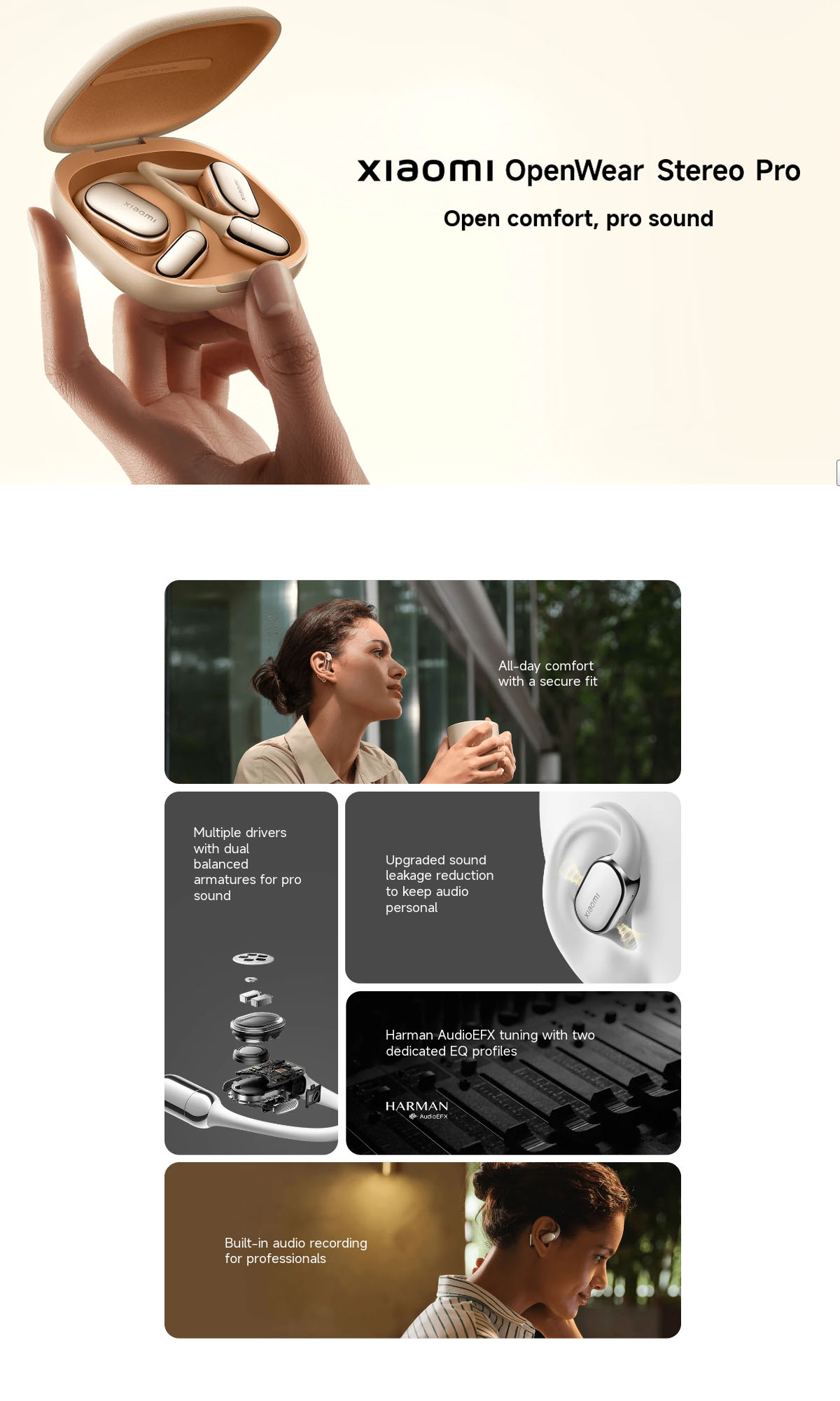 Xiaomi OpenWear Stereo Pro the exterior is wrapped in soft and comfortable skin-friendly liquid silicone. The ear hook is embedded with an ultra-thin 0.6mm flexible memory titanium wire, offering flexibility and resilience for a secure fit around the ear. The shape and size of the earbuds have been optimized to better match the ear’s natural curvature. The three-point support design distributes pressure evenly for a comfortable, barely-noticeable wearing experience. Stay aware of changes in your surroundings, no matter what you’re doing. Whether in daily life, at work, or during workouts, enjoy a truly effortless listening experience. Presenting Xiaomi’s first hybrid multiple drivers open-wear earbuds. Featuring a custom ultra-large 18 × 13mm dynamic driver with a high-polymer composite diaphragm and dual internal-external magnetic design for more powerful bass. Equipped with Hi-Fi-grade dual balanced armatures and an ultra-high-frequency piezoelectric ceramic tweeter, the earbuds deliver crisper treble and richer detail reproduction. Tuned in collaboration with experts from Harman to deliver two dedicated EQ profiles. You can also choose from multiple sound modes to suit your preferences. 360° head-tracking surround sound delivers an immersive auditory experience, absorbing you in the moment with precise spatial sound.