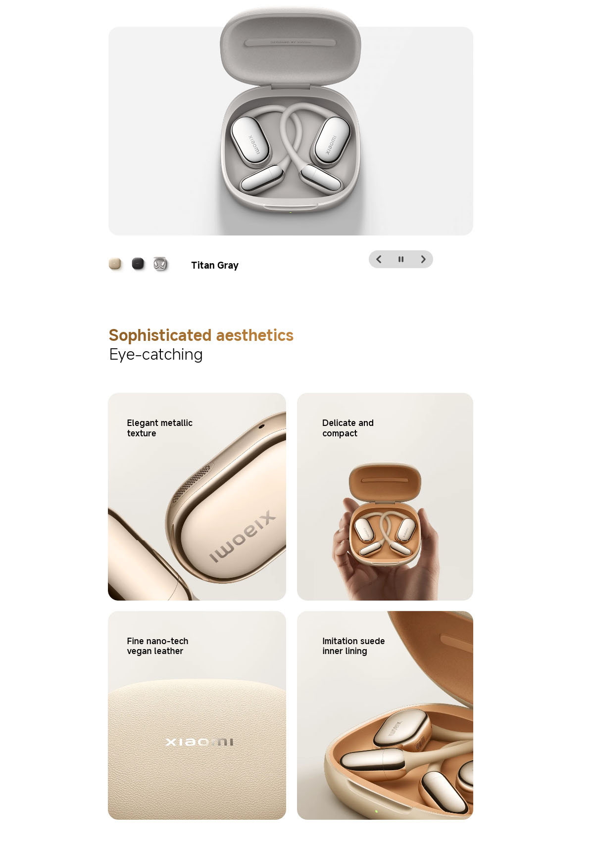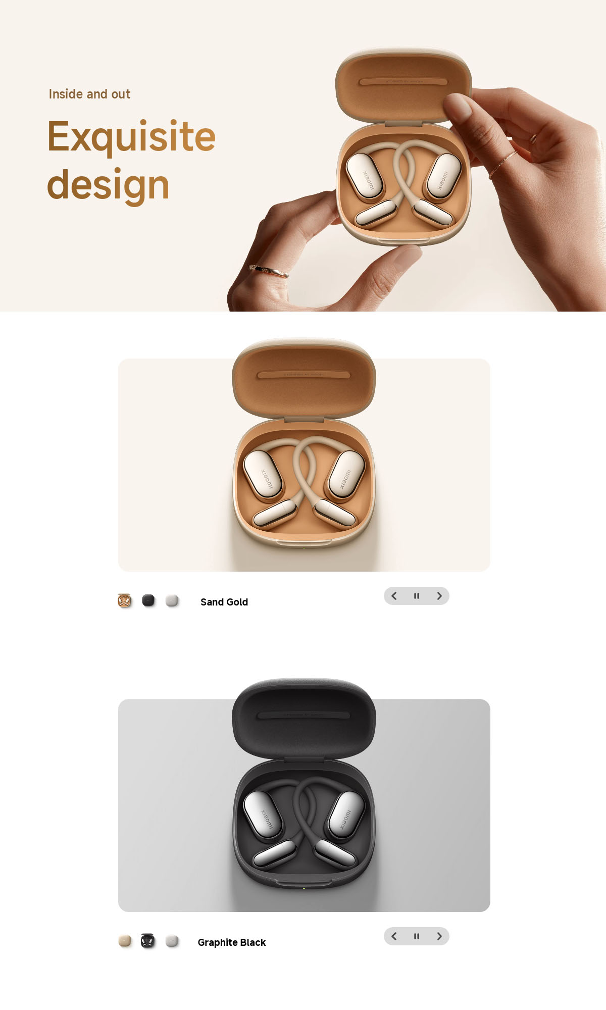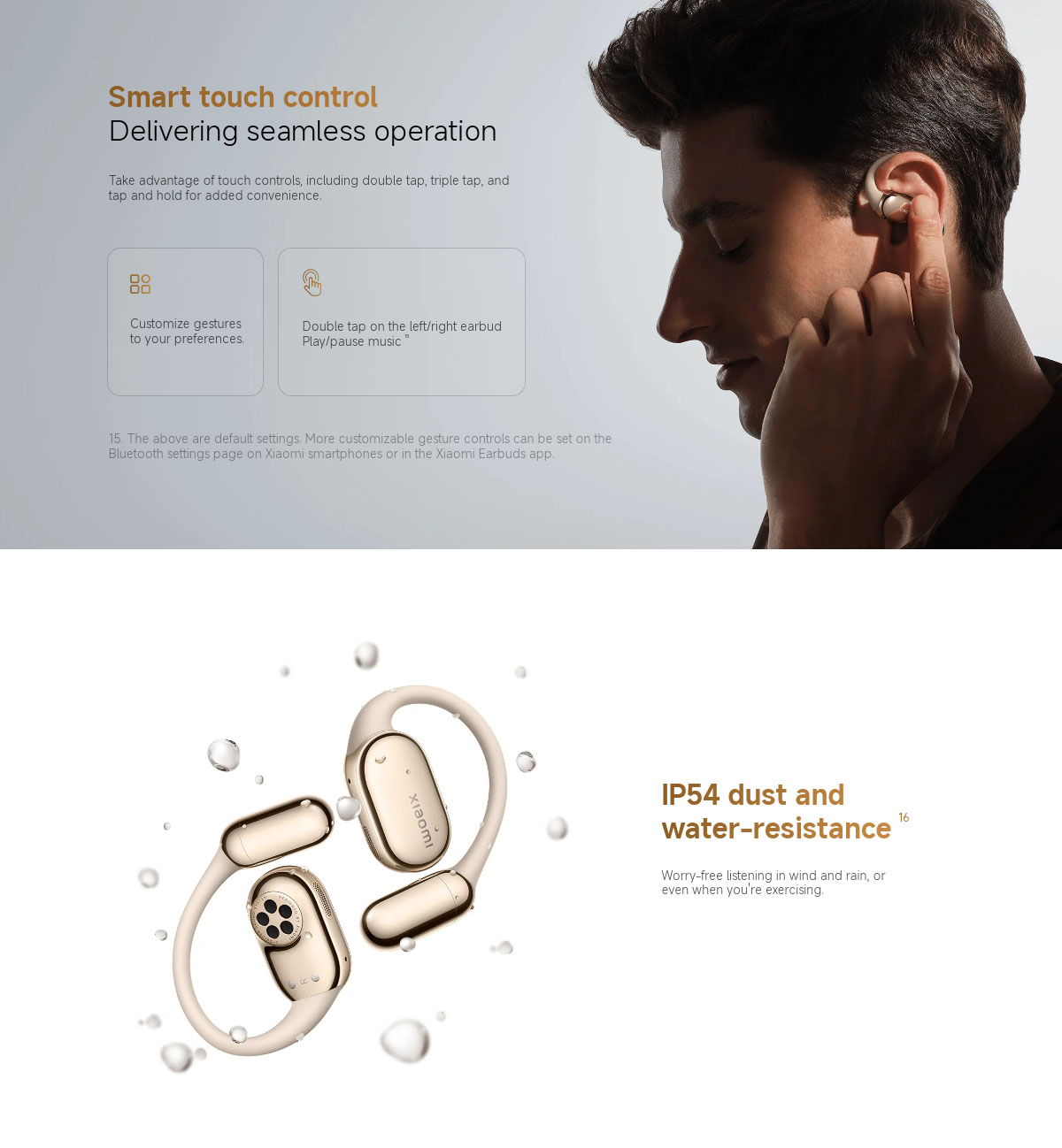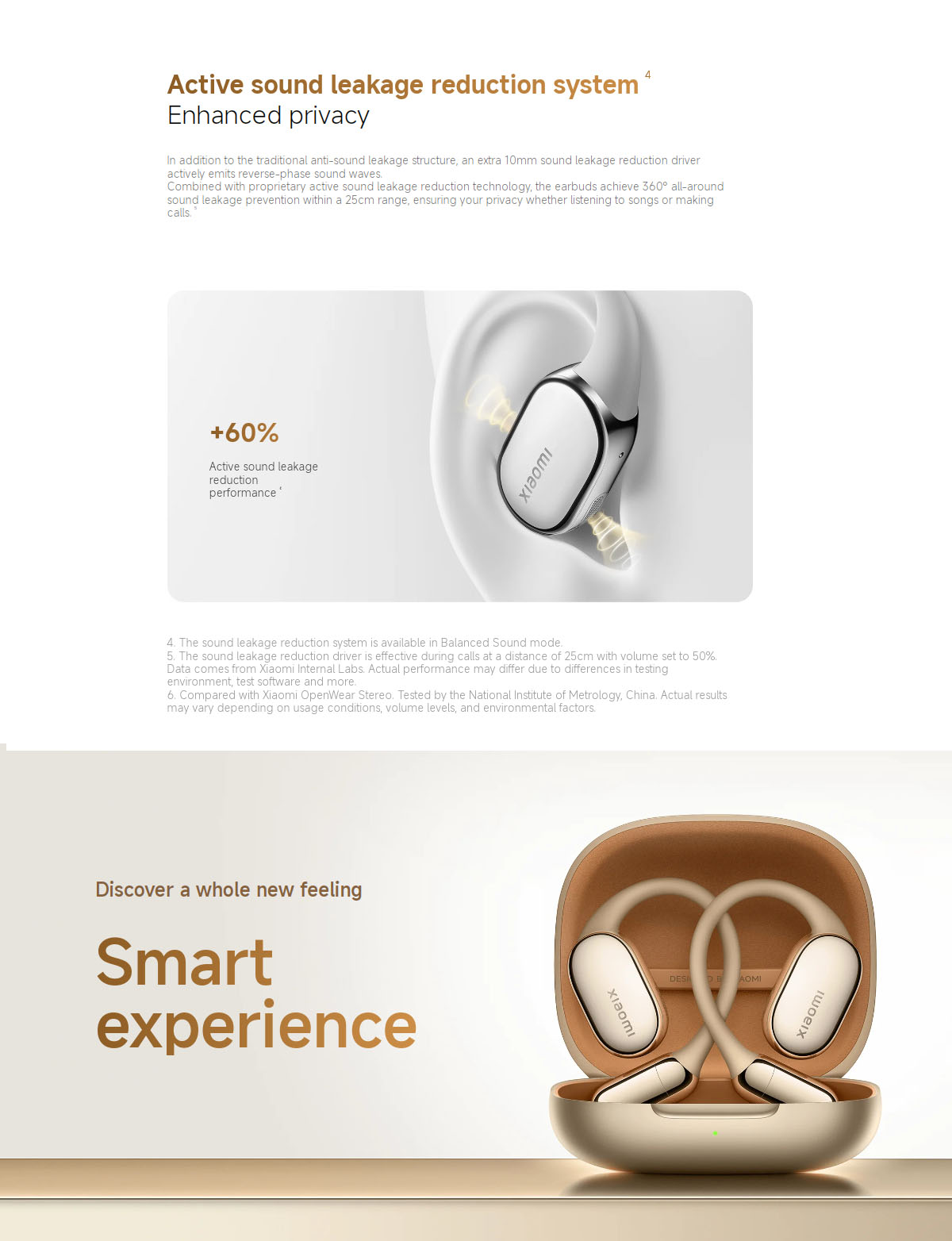 Xiaomi OpenWear Stereo Pro the exterior is wrapped in soft and comfortable skin-friendly liquid silicone. The ear hook is embedded with an ultra-thin 0.6mm flexible memory titanium wire, offering flexibility and resilience for a secure fit around the ear. The shape and size of the earbuds have been optimized to better match the ear’s natural curvature. The three-point support design distributes pressure evenly for a comfortable, barely-noticeable wearing experience. Stay aware of changes in your surroundings, no matter what you’re doing. Whether in daily life, at work, or during workouts, enjoy a truly effortless listening experience. Presenting Xiaomi’s first hybrid multiple drivers open-wear earbuds. Featuring a custom ultra-large 18 × 13mm dynamic driver with a high-polymer composite diaphragm and dual internal-external magnetic design for more powerful bass. Equipped with Hi-Fi-grade dual balanced armatures and an ultra-high-frequency piezoelectric ceramic tweeter, the earbuds deliver crisper treble and richer detail reproduction. Tuned in collaboration with experts from Harman to deliver two dedicated EQ profiles. You can also choose from multiple sound modes to suit your preferences. 360° head-tracking surround sound delivers an immersive auditory experience, absorbing you in the moment with precise spatial sound.