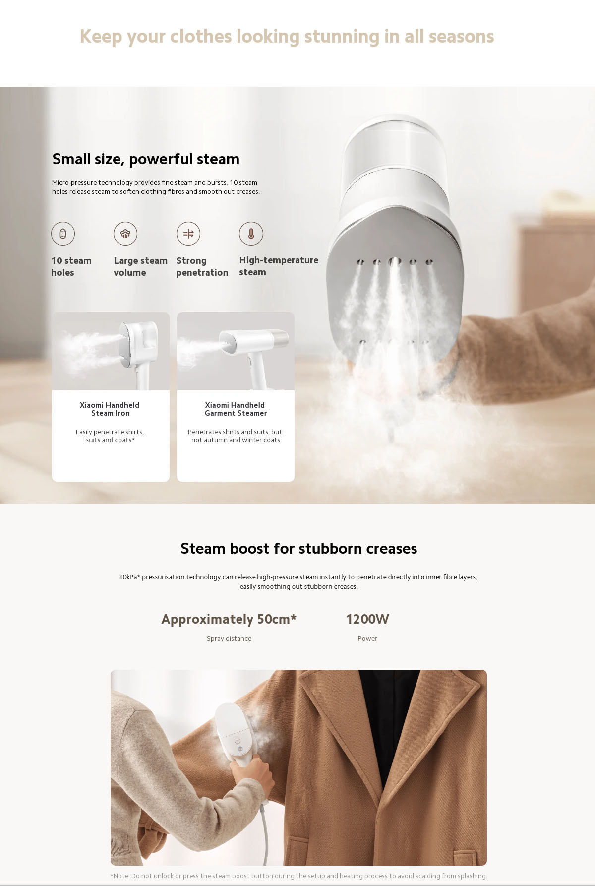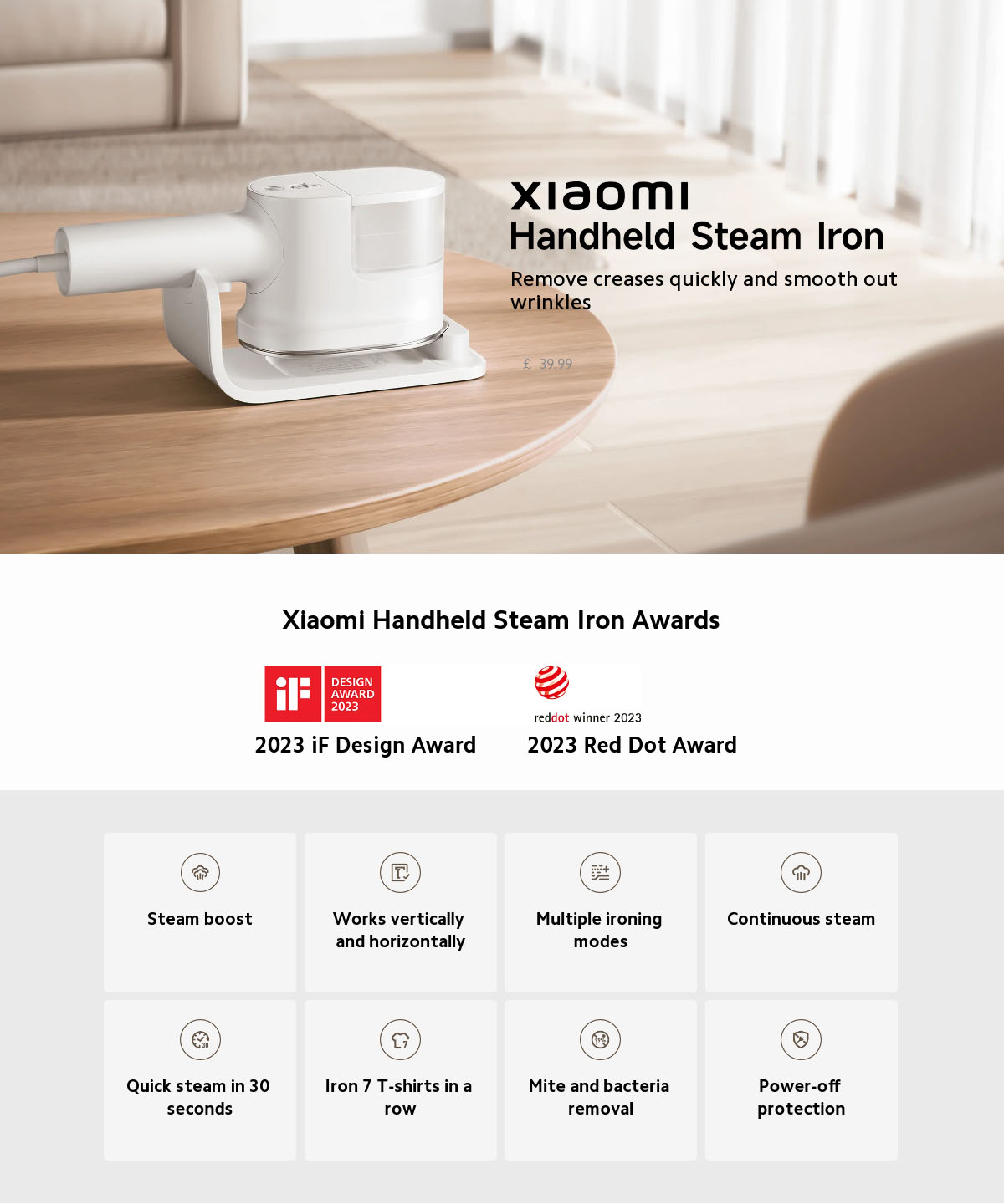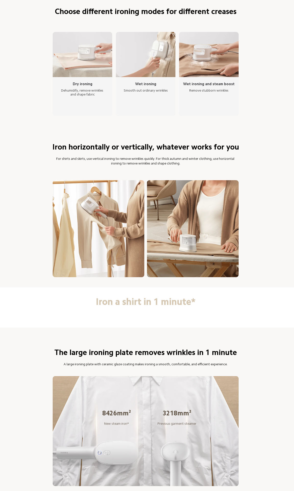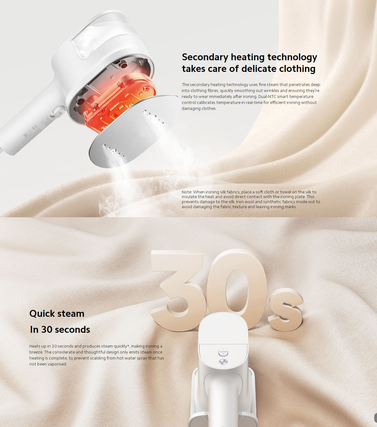 Xiaomi Handheld Steam Iron Micro-pressure technology provides fine steam and bursts. 10 steam holes release steam to soften clothing fibres and smooth out creases. 30kPa pressurisation technology can release high-pressure steam instantly to penetrate directly into inner fibre layers, easily smoothing out stubborn creases. For shirts and skirts, use vertical ironing to remove wrinkles quickly. For thick autumn and winter clothing, use horizontal ironing to remove wrinkles and shape clothing. A large ironing plate with ceramic glaze coating makes ironing a smooth, comfortable, and efficient experience. The secondary heating technology uses fine steam that penetrates deep into clothing fibres, quickly smoothing out wrinkles and ensuring they’re ready to wear immediately after ironing. Dual-NTC smart temperature control calibrates temperature in real-time for efficient ironing without damaging clothes.