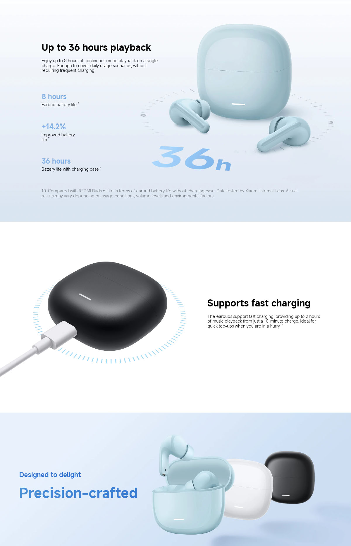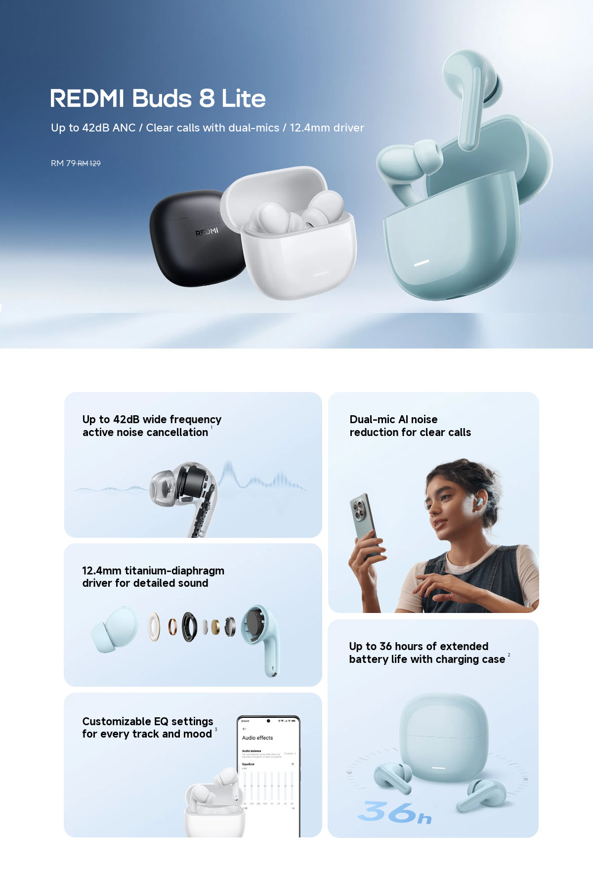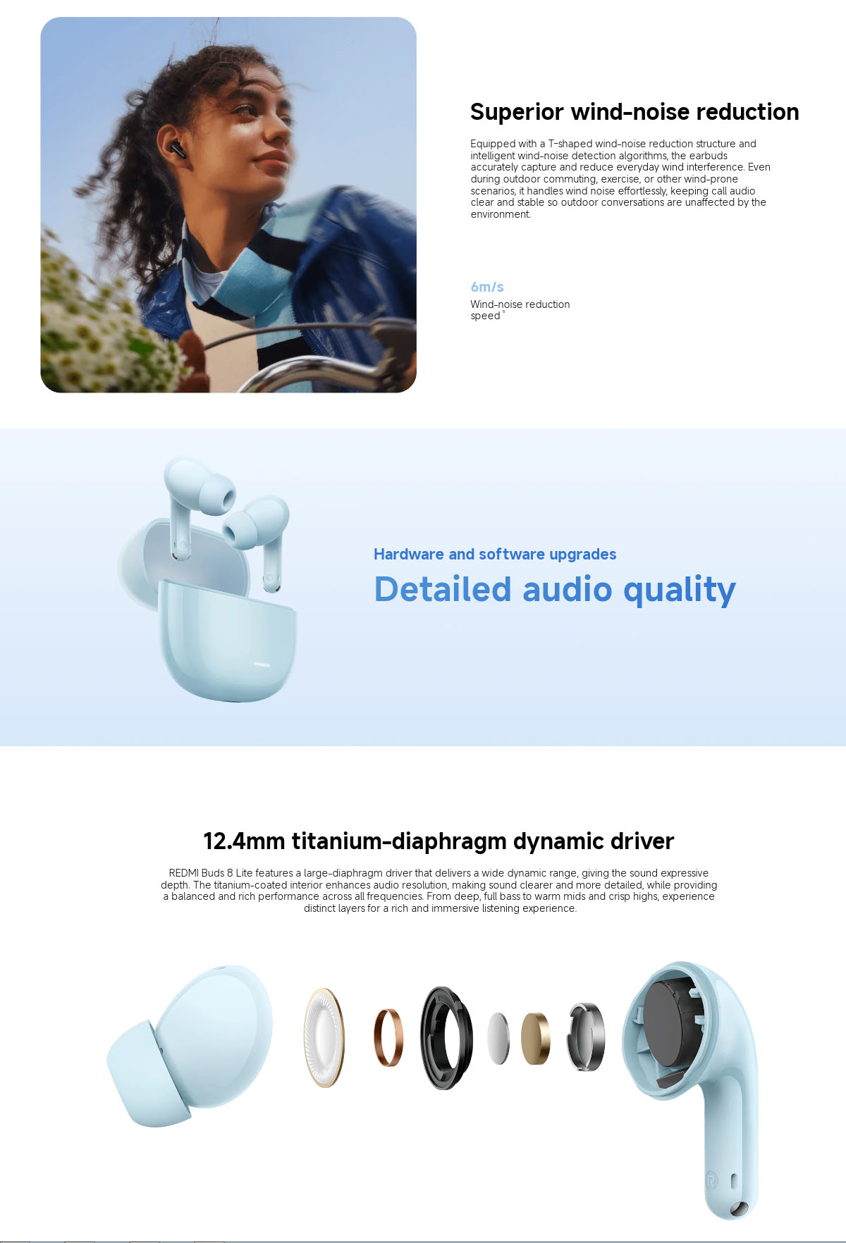 Xiaomi Redmi Buds 8 Lite powered by dual-channel AI noise suppression algorithm, the earbuds can accurately distinguish target voices from background noise in complex environments. This combination ensures stable and consistent noise reduction and prevents over-cancellation from “cutting off” the ends of words. In calls, online meetings, live streaming and other scenarios, it ensures your voice remains clear and intelligible for efficient, uninterrupted communication. Hybrid ANC solution with integrated microphones accurately detects and reduces a variety of low-frequency noises, such as subway rumble or air conditioning, creating a quieter listening environment for you. Equipped with a T-shaped wind-noise reduction structure and intelligent wind-noise detection algorithms, the earbuds accurately capture and reduce everyday wind interference. Even during outdoor commuting, exercise, or other wind-prone scenarios, it handles wind noise effortlessly, keeping call audio clear and stable so outdoor conversations are unaffected by the environment. REDMI Buds 8 Lite features a large-diaphragm driver that delivers a wide dynamic range, giving the sound expressive depth. The titanium-coated interior enhances audio resolution, making sound clearer and more detailed, while providing a balanced and rich performance across all frequencies. From deep, full bass to warm mids and crisp highs, experience distinct layers for a rich and immersive listening experience.